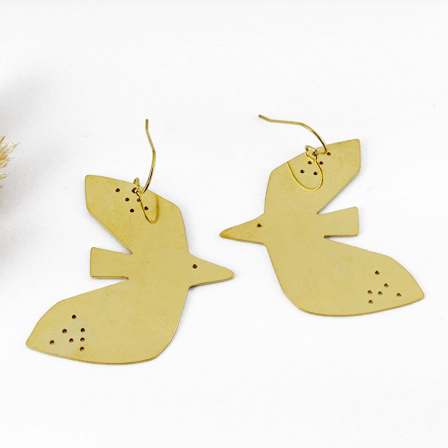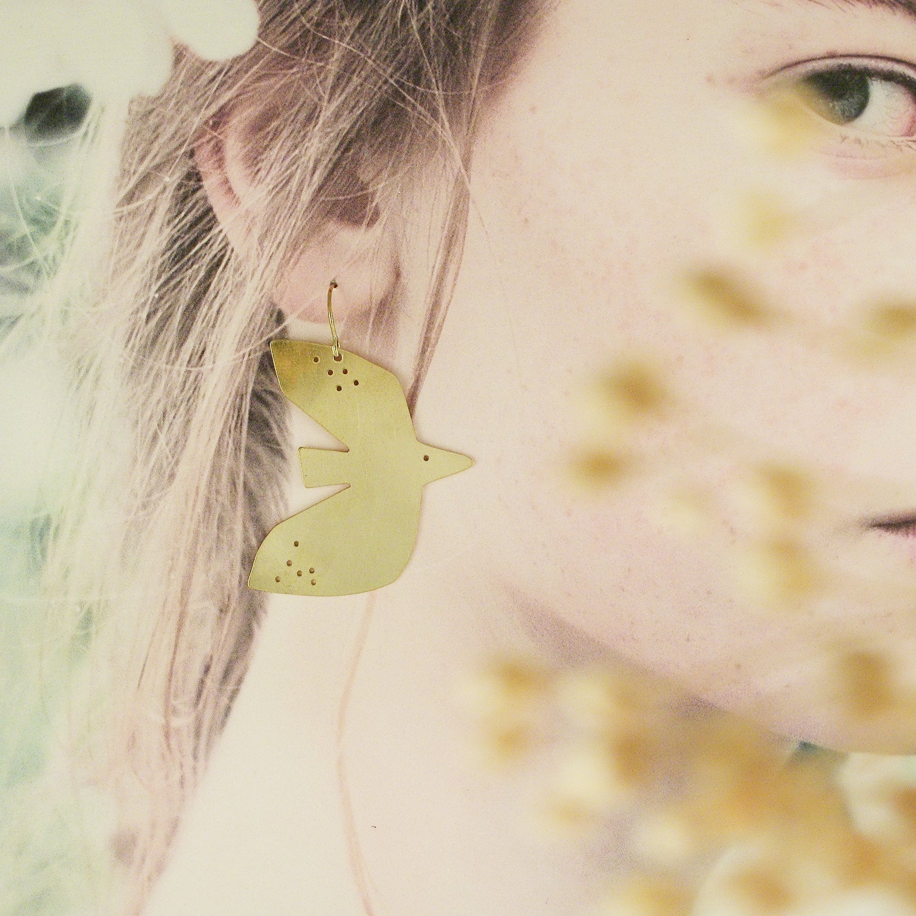 Boucle d'oreille oiseau en laiton entièrement faite à la main par FOUGÈRE à Grez-Doiceau, Belgique.