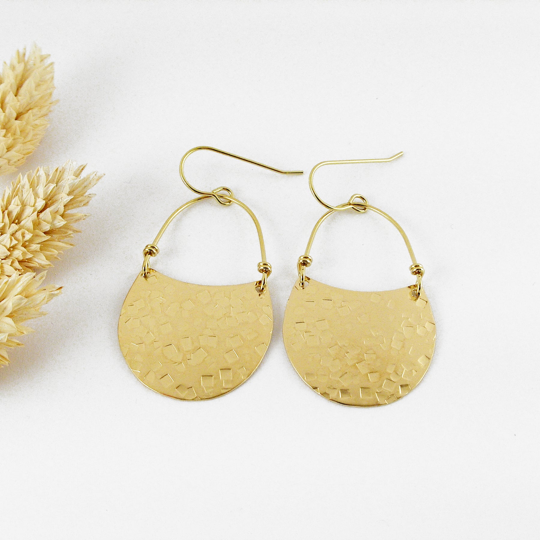 Boucle d'oreille croissant d'ovale en laiton martelée faite à la main par FOUGÈRE à Grez-Doiceau, Belgique.
