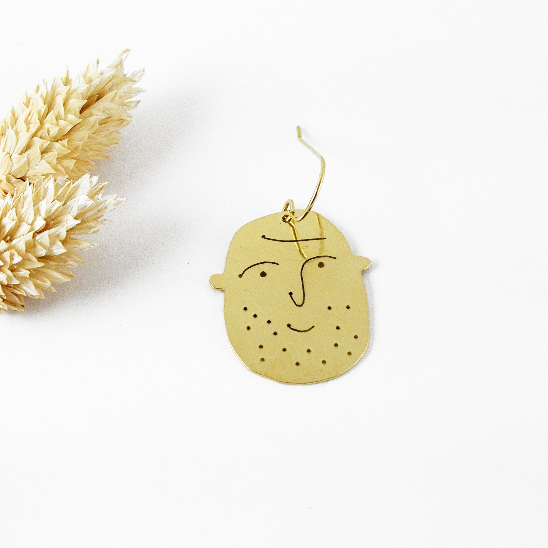 Boucle d'oreille visage en laiton faite à la main par FOUGÈRE à Grez-Doiceau, Belgique.