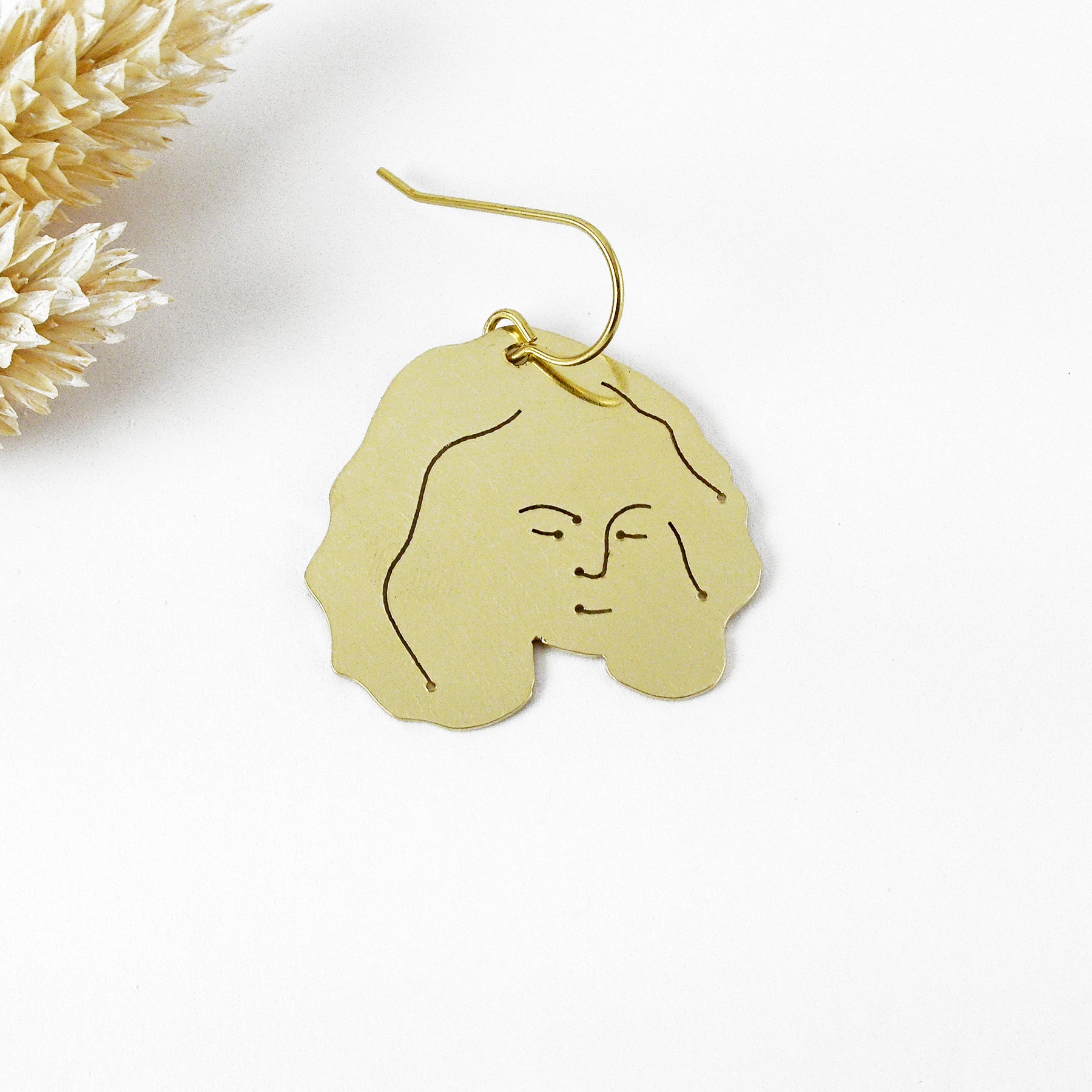 Boucle d'oreille visage en laiton faite à la main par FOUGÈRE à Grez-Doiceau, Belgique.
