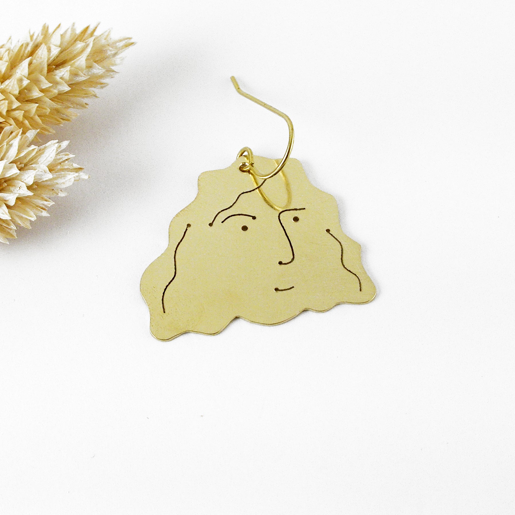 Boucle d'oreille visage en laiton faite à la main par FOUGÈRE à Grez-Doiceau, Belgique.