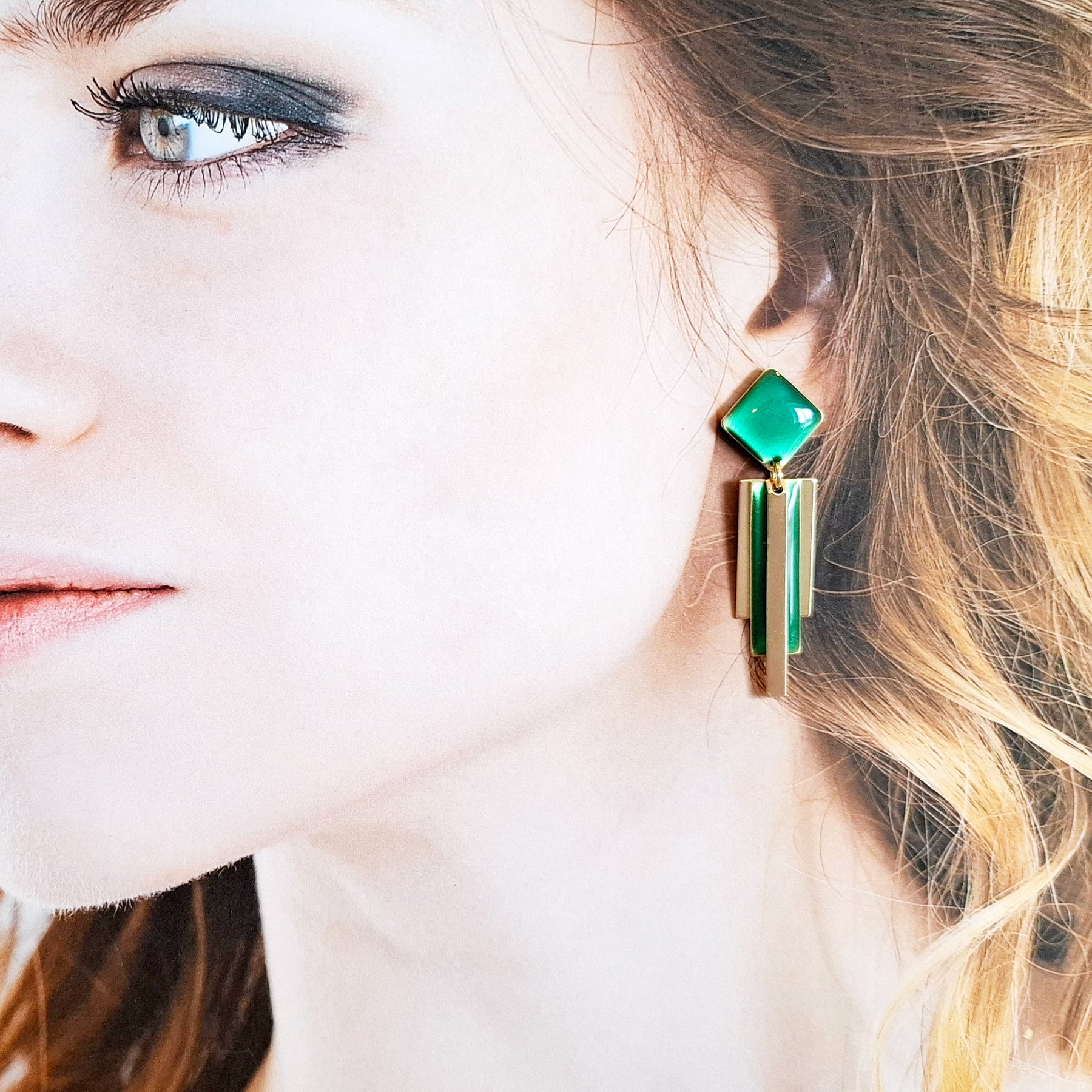 Boucles d'oreille symétriques géométriques en laiton brut résinées à la main par FOUGÈRE à Grez-Doiceau, Belgique.