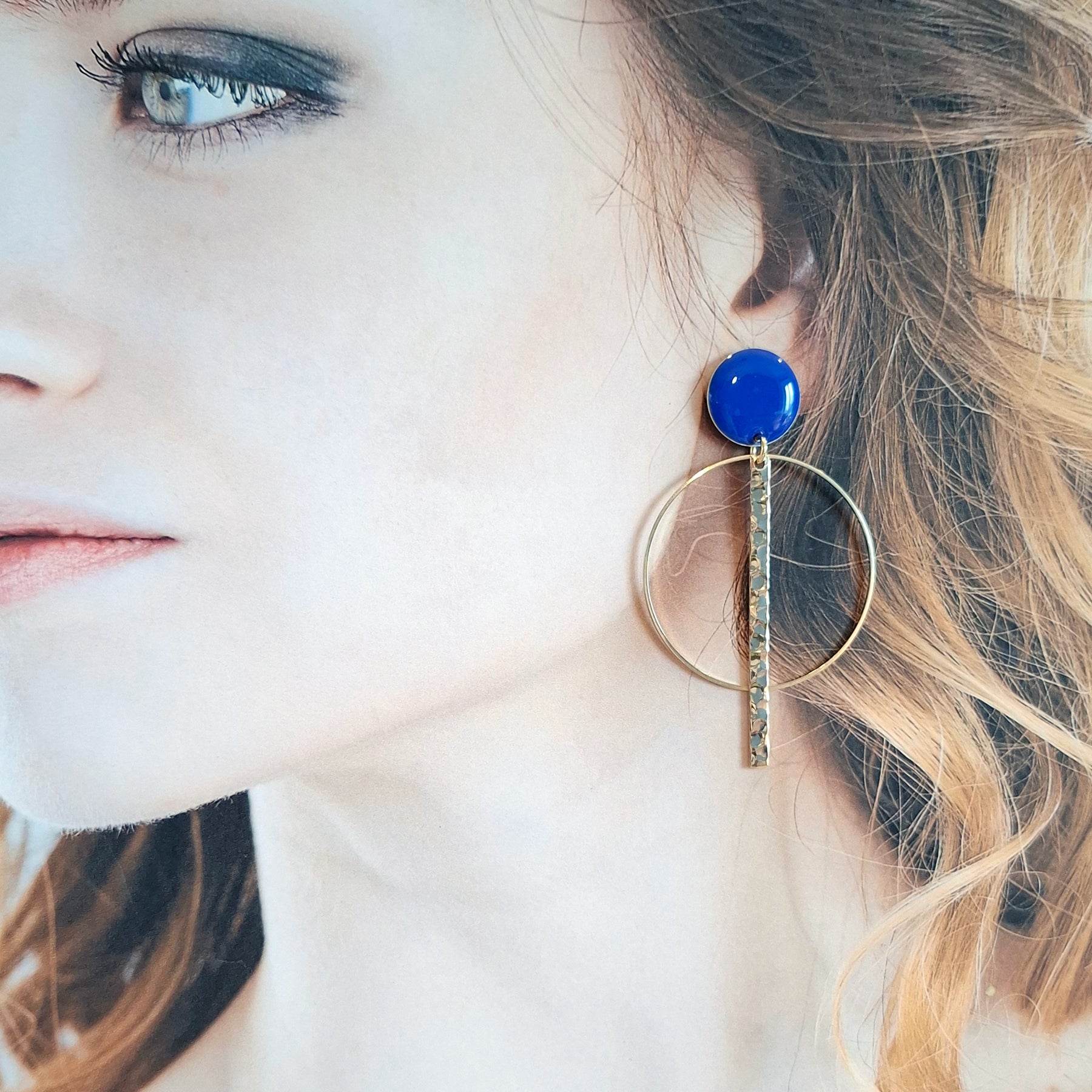 Boucles d'oreille asymétriques géométriques en laiton brut résinées à la main par FOUGÈRE à Grez-Doiceau, Belgique.