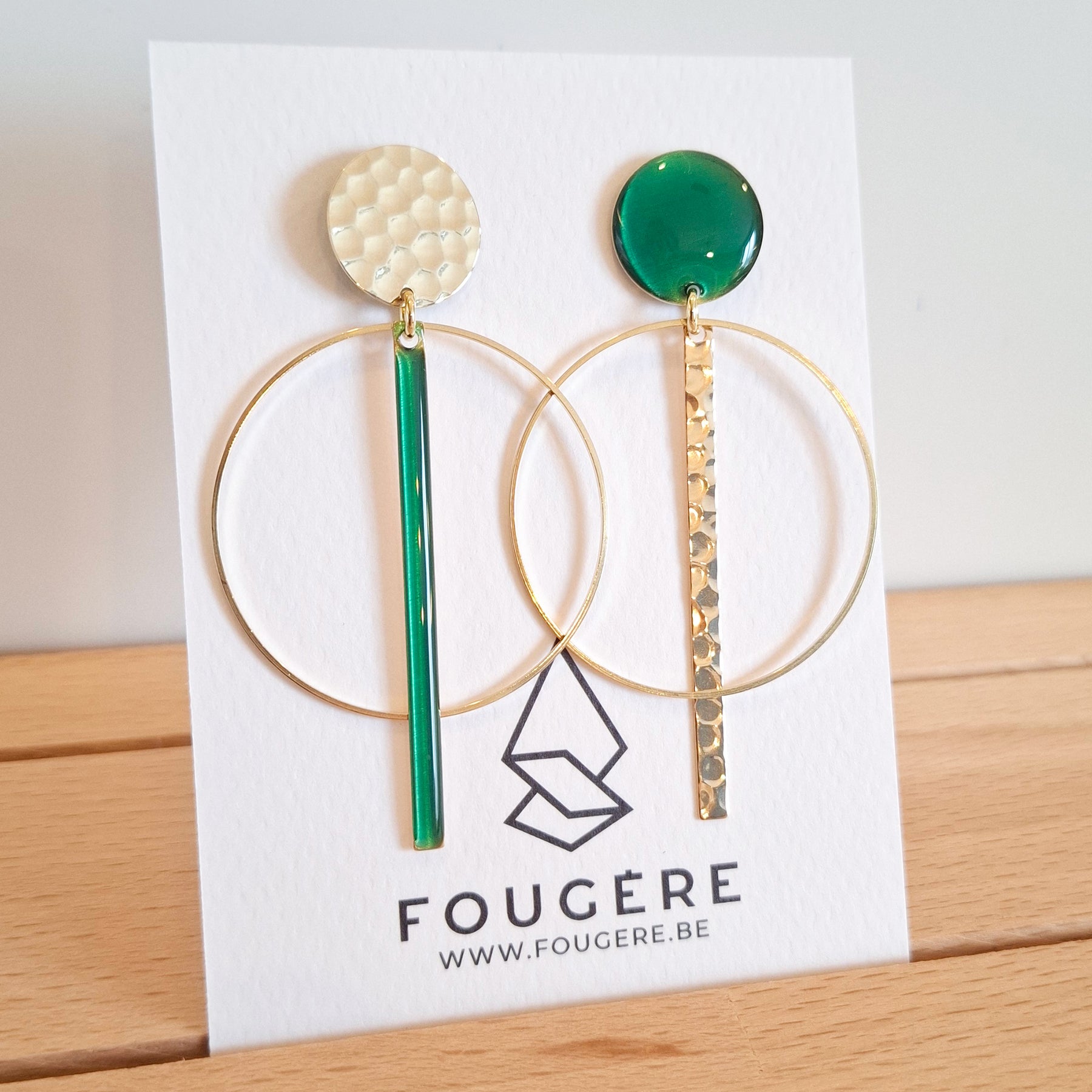 Boucles d'oreille asymétriques géométriques en laiton brut résinées à la main par FOUGÈRE à Grez-Doiceau, Belgique.