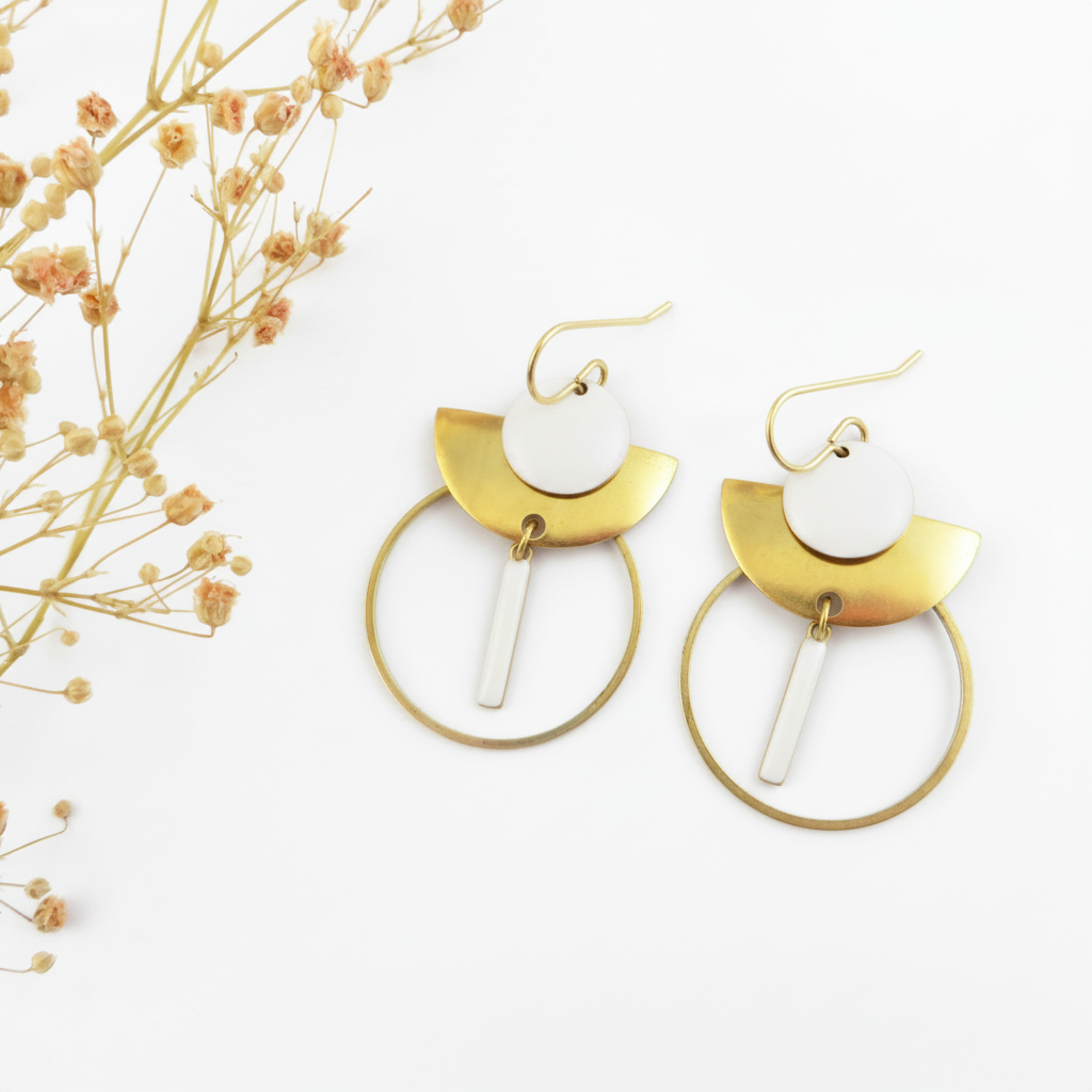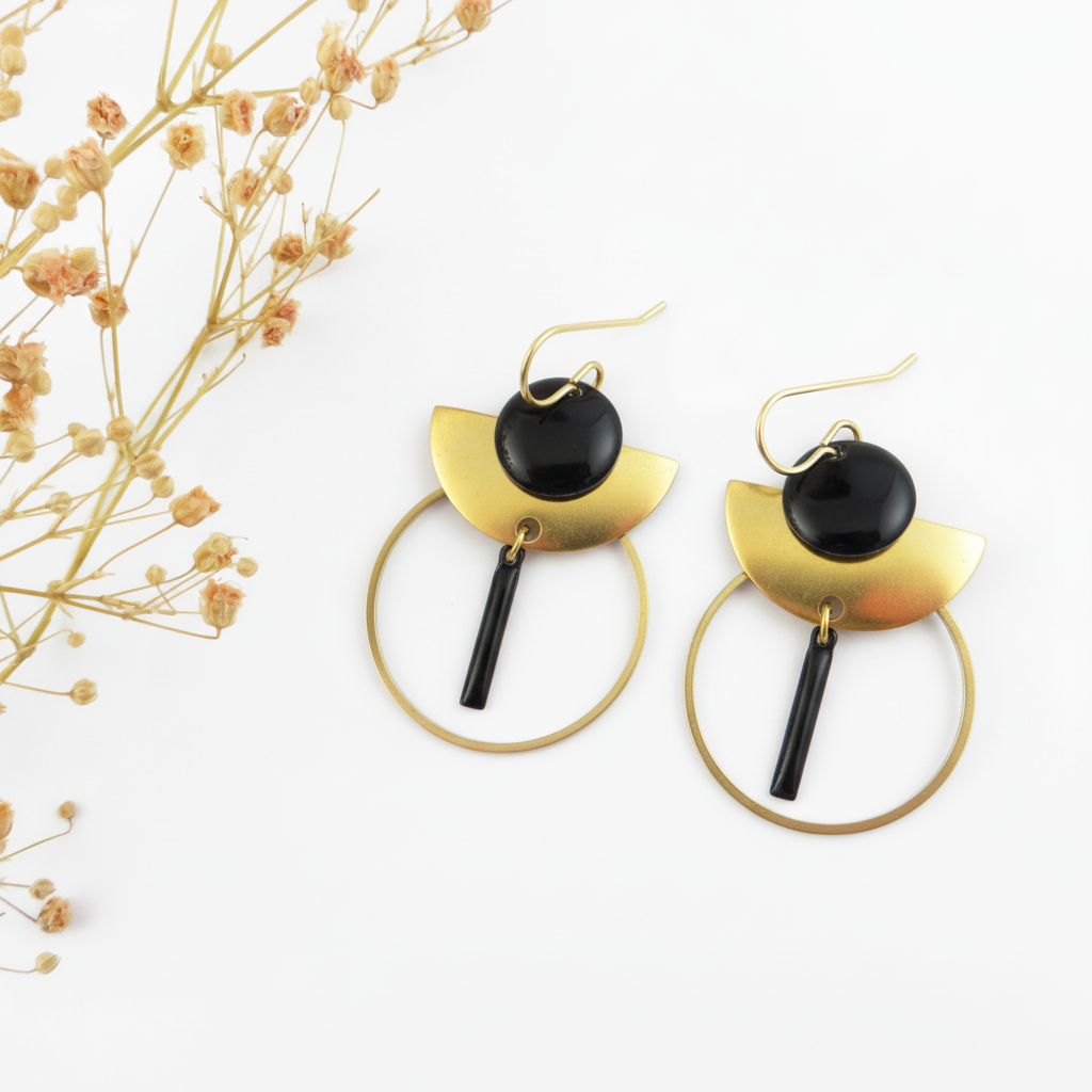 Boucles d'oreilles demi-lune géométriques en laiton brut émaillées à froid à la main par FOUGÈRE à Grez-Doiceau, Belgique.