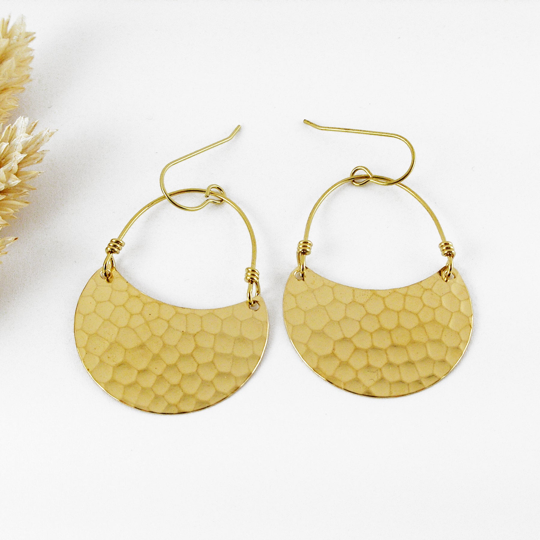 Boucle d'oreille martelée en laiton faite à la main par FOUGÈRE à Grez-Doiceau, Belgique.