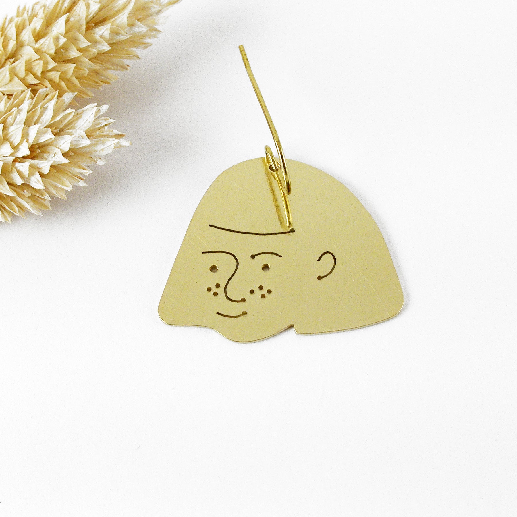 Boucle d'oreille visage en laiton faite à la main par FOUGÈRE à Grez-Doiceau, Belgique.