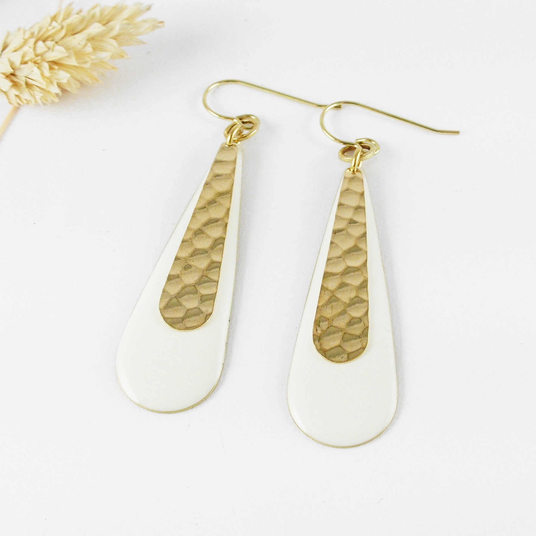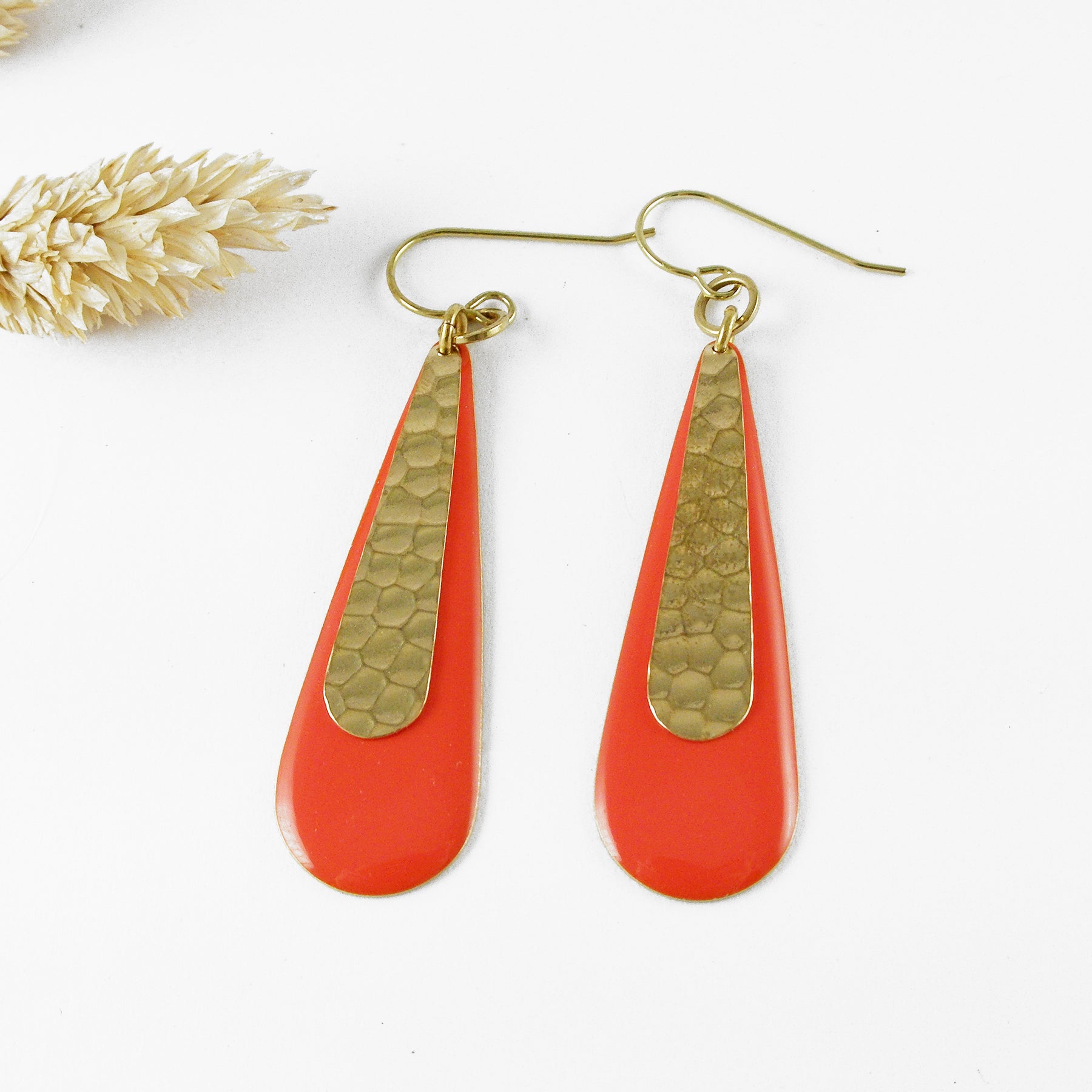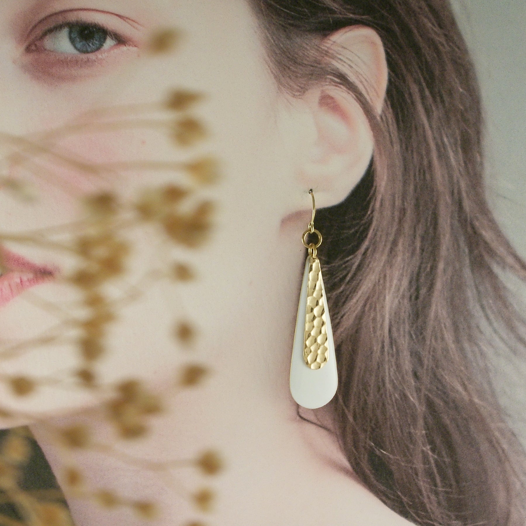 Boucle d'oreille longue goutte symétrique géométrique en laiton martelé et sa résine double composantes posée à la main par FOUGÈRE à Grez-Doiceau, Belgique.