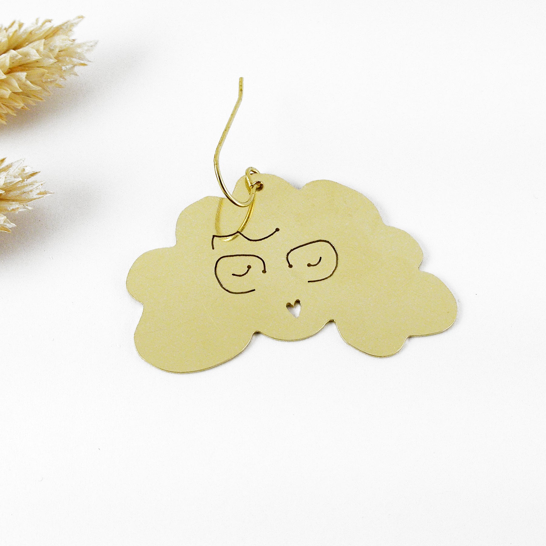 Boucle d'oreille visage en laiton faite à la main par FOUGÈRE à Grez-Doiceau, Belgique.