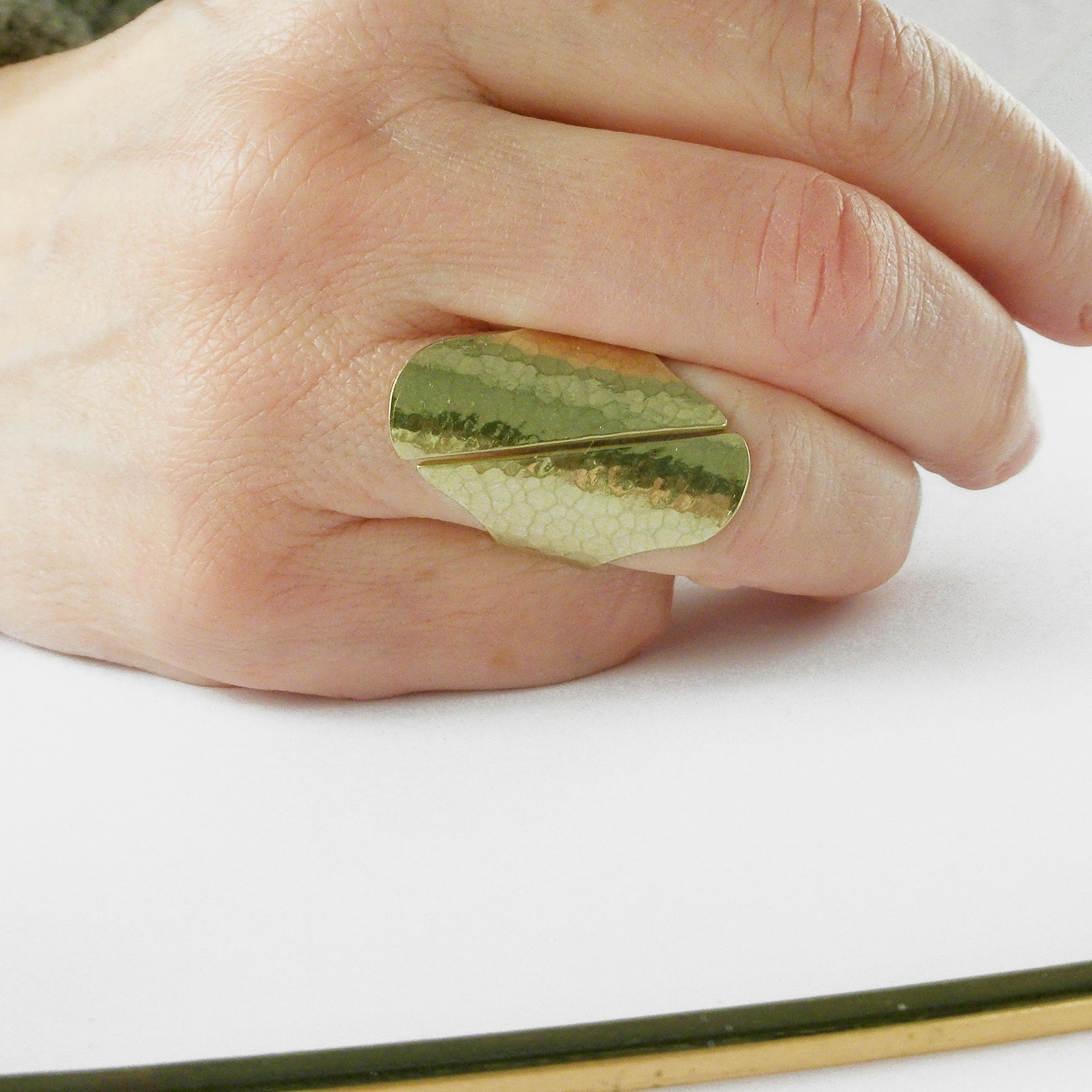 La Katachi, une bague manchette ovale en laiton martelé faite entièrement à la main dans mon atelier de Grez-Doiceau, Belgique. En partant de la plaque de laiton, le modèle est découpé, martelé, finalisé et poli entièrement à la main.
