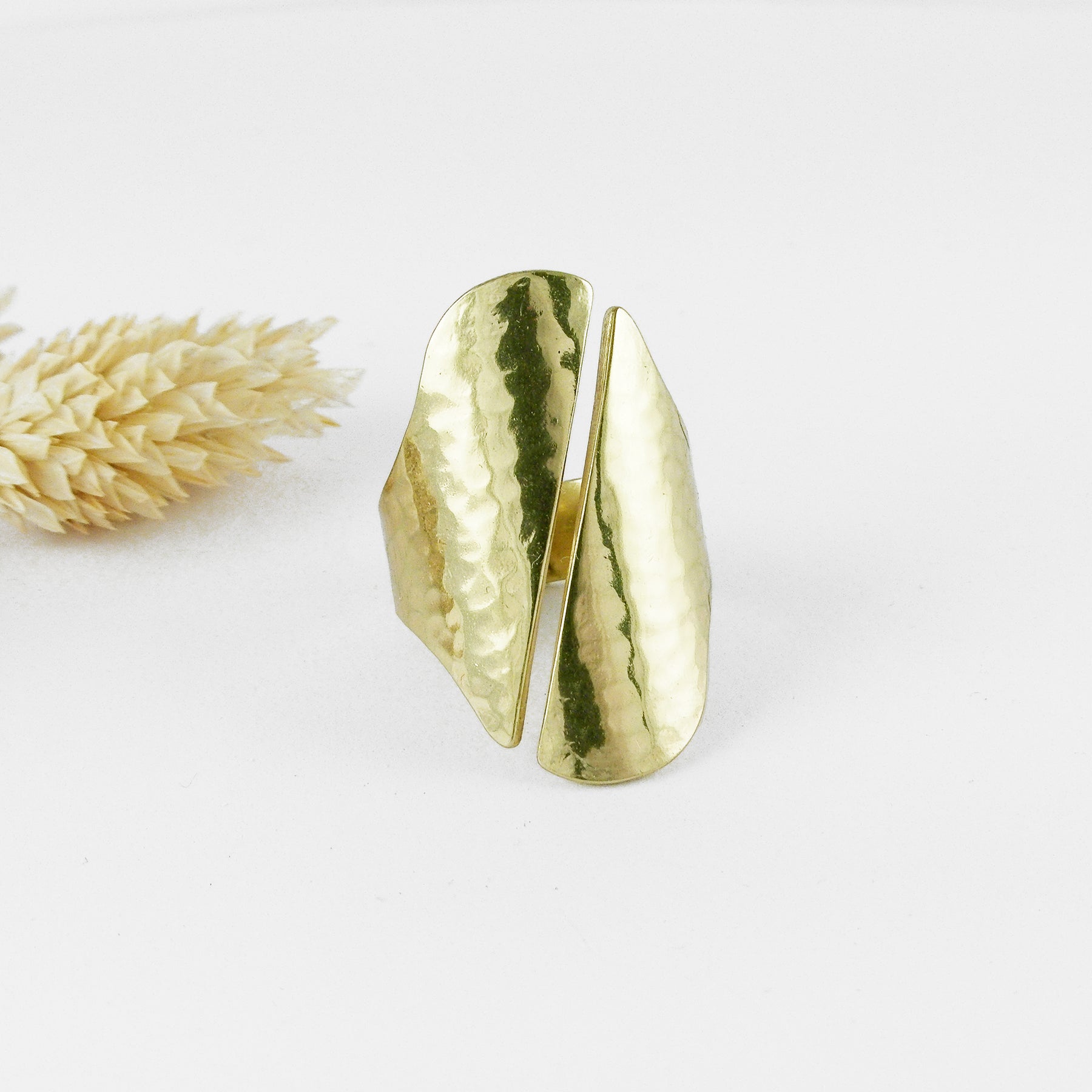 Cette bague est en laiton entièrement découpées, martelées et travaillées à la main. Si vous choisissez la finition laiton « nu », le laiton sera sans finition.