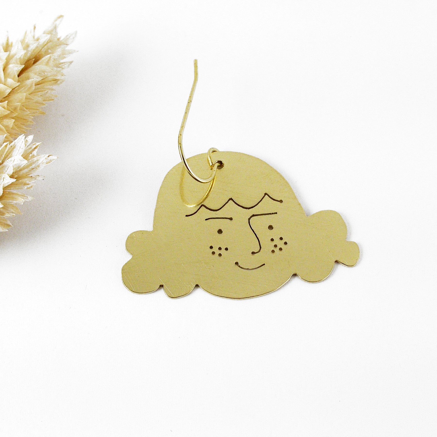 Boucle d'oreille visage en laiton faite à la main par FOUGÈRE à Grez-Doiceau, Belgique.