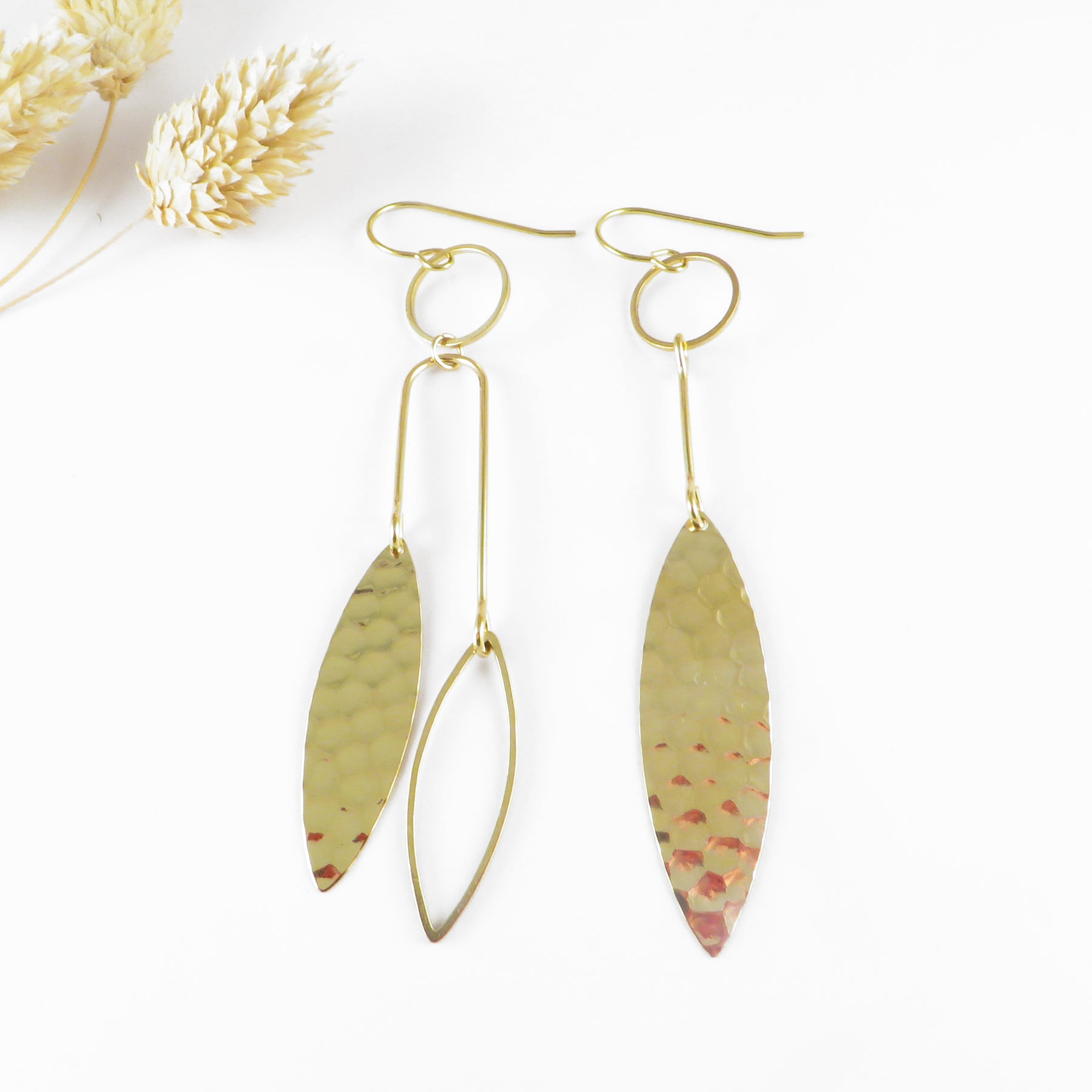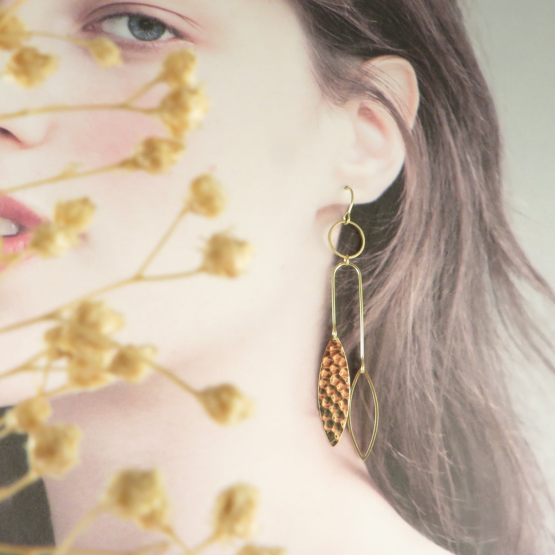 Boucle d'oreille mobile navette en laiton brut fait à la main par FOUGÈRE à Grez-Doiceau, Belgique.