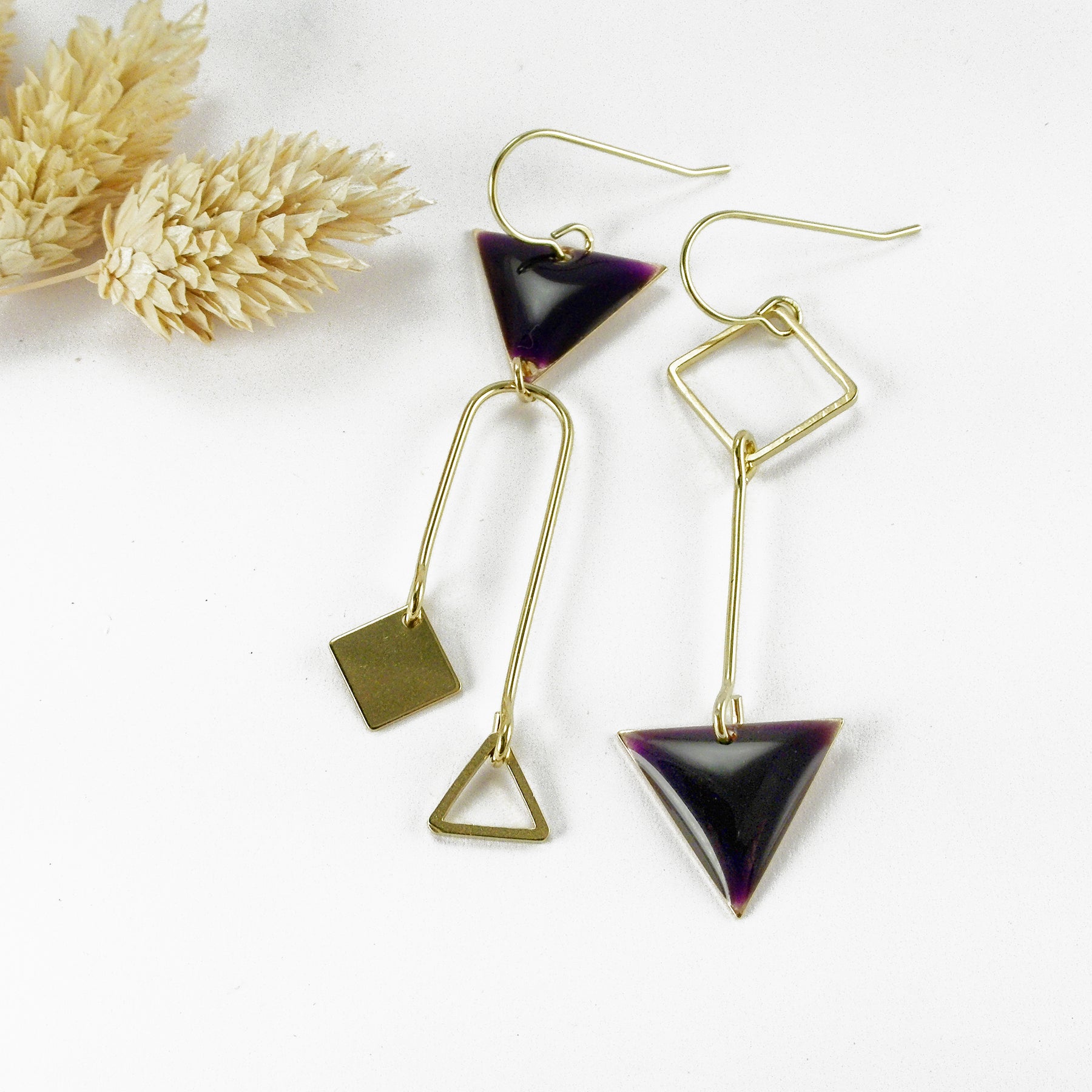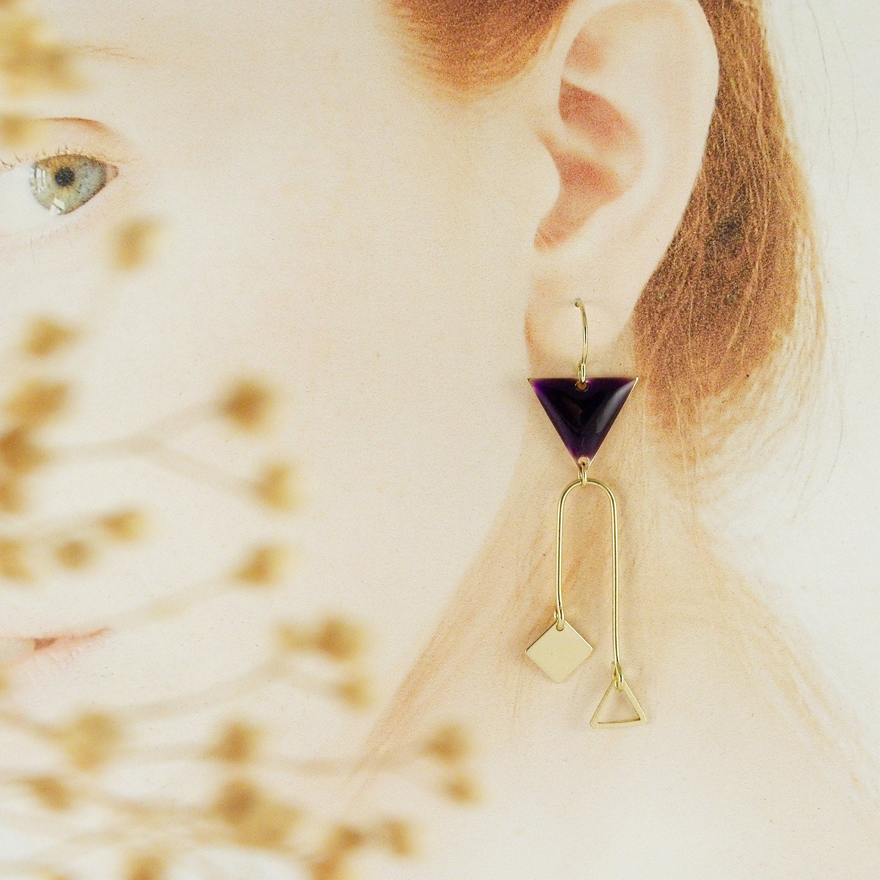 Boucle d'oreille mobile cinétique triangle asymétrique géométrique en laiton et sa résine double composantes posée à la main par FOUGÈRE à Grez-Doiceau, Belgique.