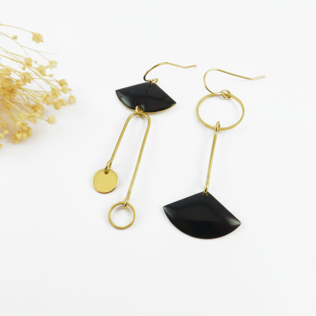 Boucle d'oreille mobile cinétique asymétrique géométrique en laiton brut et sa résine double composantes posée à la main par FOUGÈRE à Grez-Doiceau, Belgique.