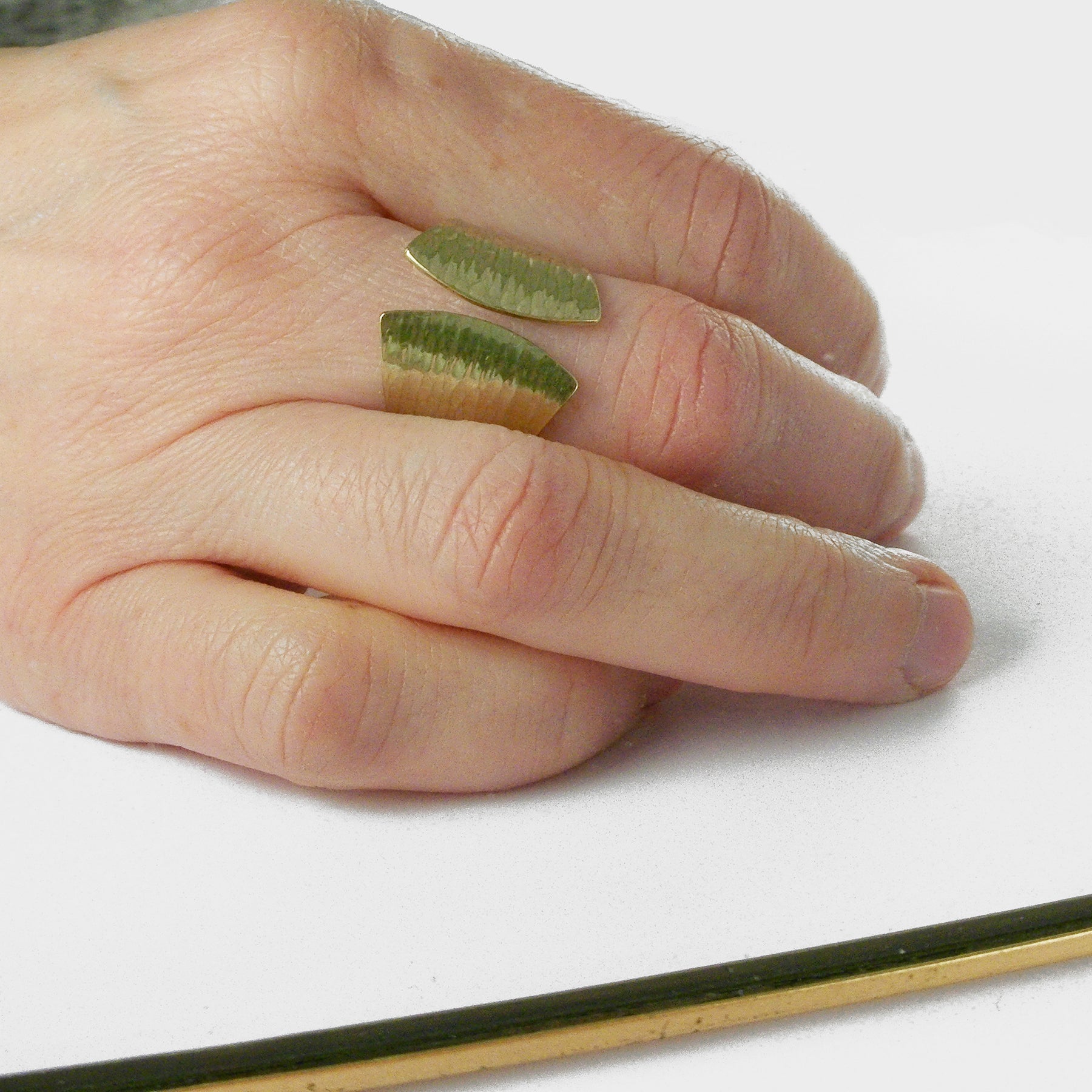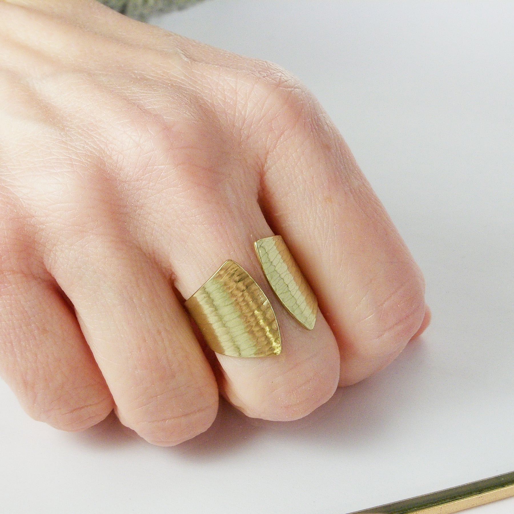 La Yubiwa, la petite sœur de la Saori : bague manchette en laiton martelé ligné faite entièrement à la main dans mon atelier de Grez-Doiceau, Belgique. En partant de la plaque de laiton, le modèle est découpé, martelé, finalisé et poli entièrement à la main.